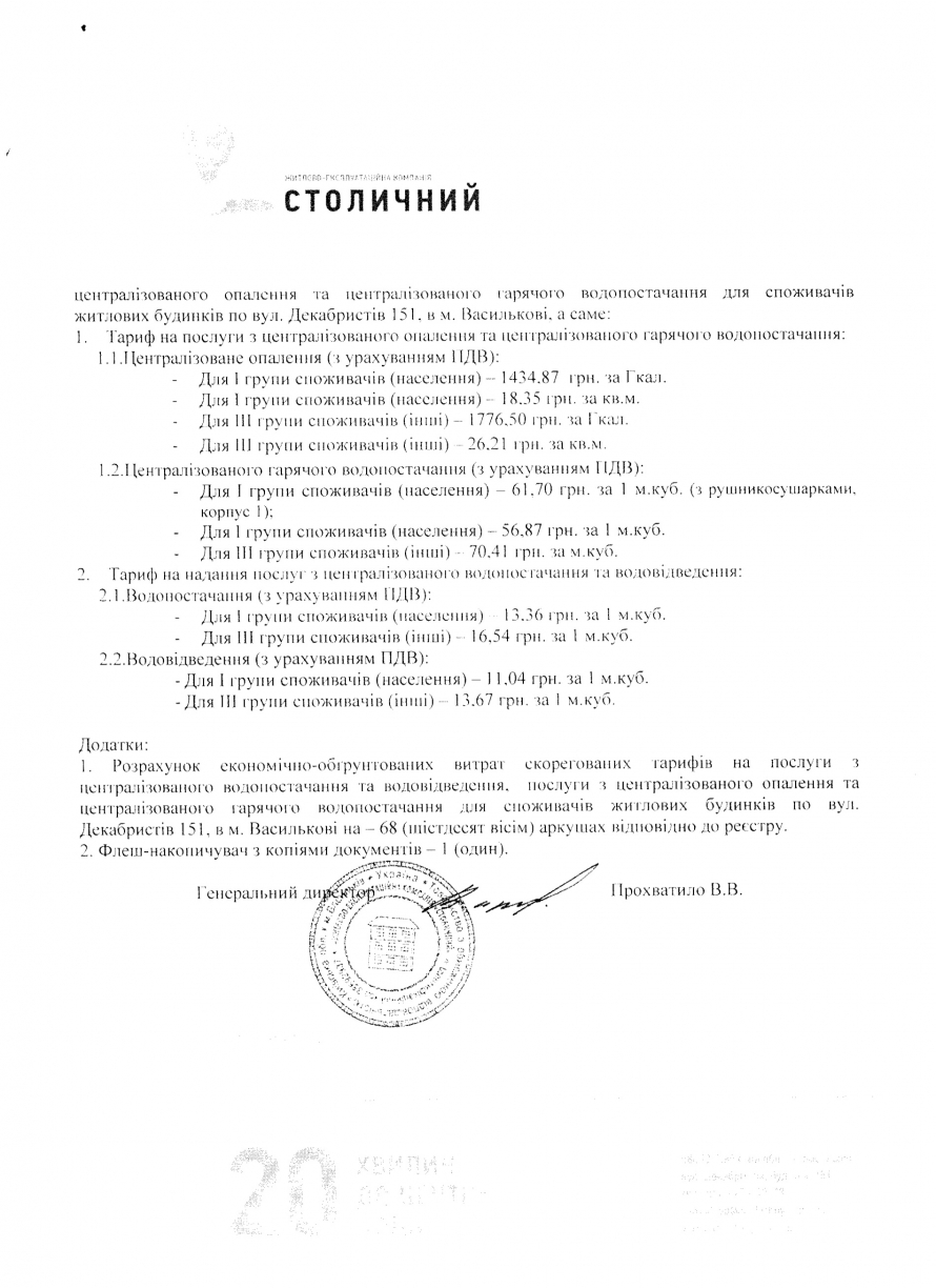 ПОВІДОМЛЕННЯ «Про зміну тарифу на послуги з централізованого опалення, гарячого водопостачання, централізованого водопостачання, та водовідведення в ЖК «Столичний».