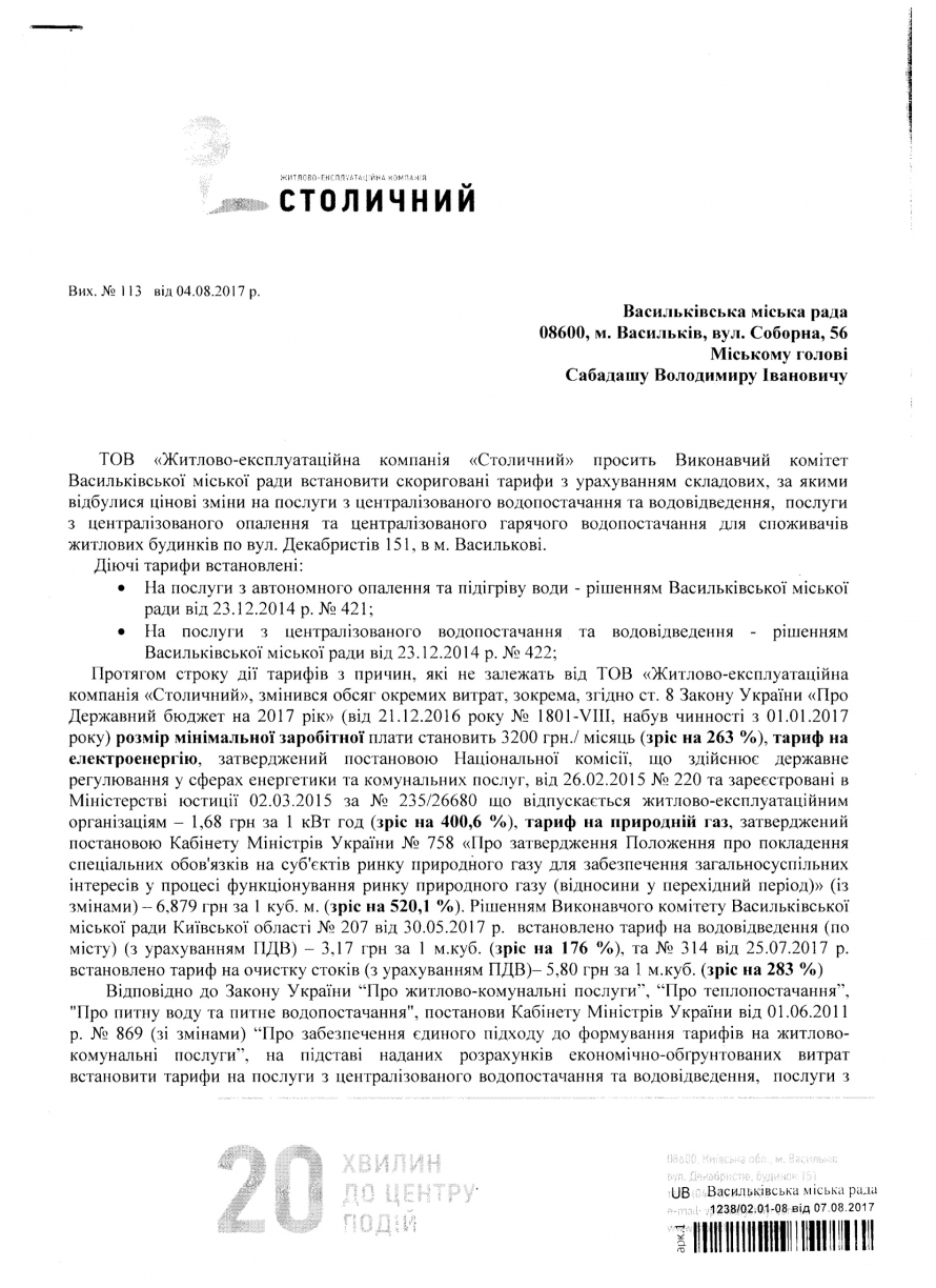 На виконання Порядку доведення до споживачів інформації про перелік житлово-комунальних послуг, структуру ціни/тарифів, зміну цін/тарифів з обґрунтуванням її необхідності та про врахування відповідної позиції територіальних громад (затв. Наказом Мінрегіону України від 30.07.2012 року № 390), ТОВ «Житлово-експлуатаційна компанія «Столичний» доводить до відома споживачів житлових будинків по вул. Декабристів, №151, м. Василькова (ЖК Столичний), щодо необхідності проведення коригування тарифів у зв’язку з зростанням вартості основних складових тарифу.